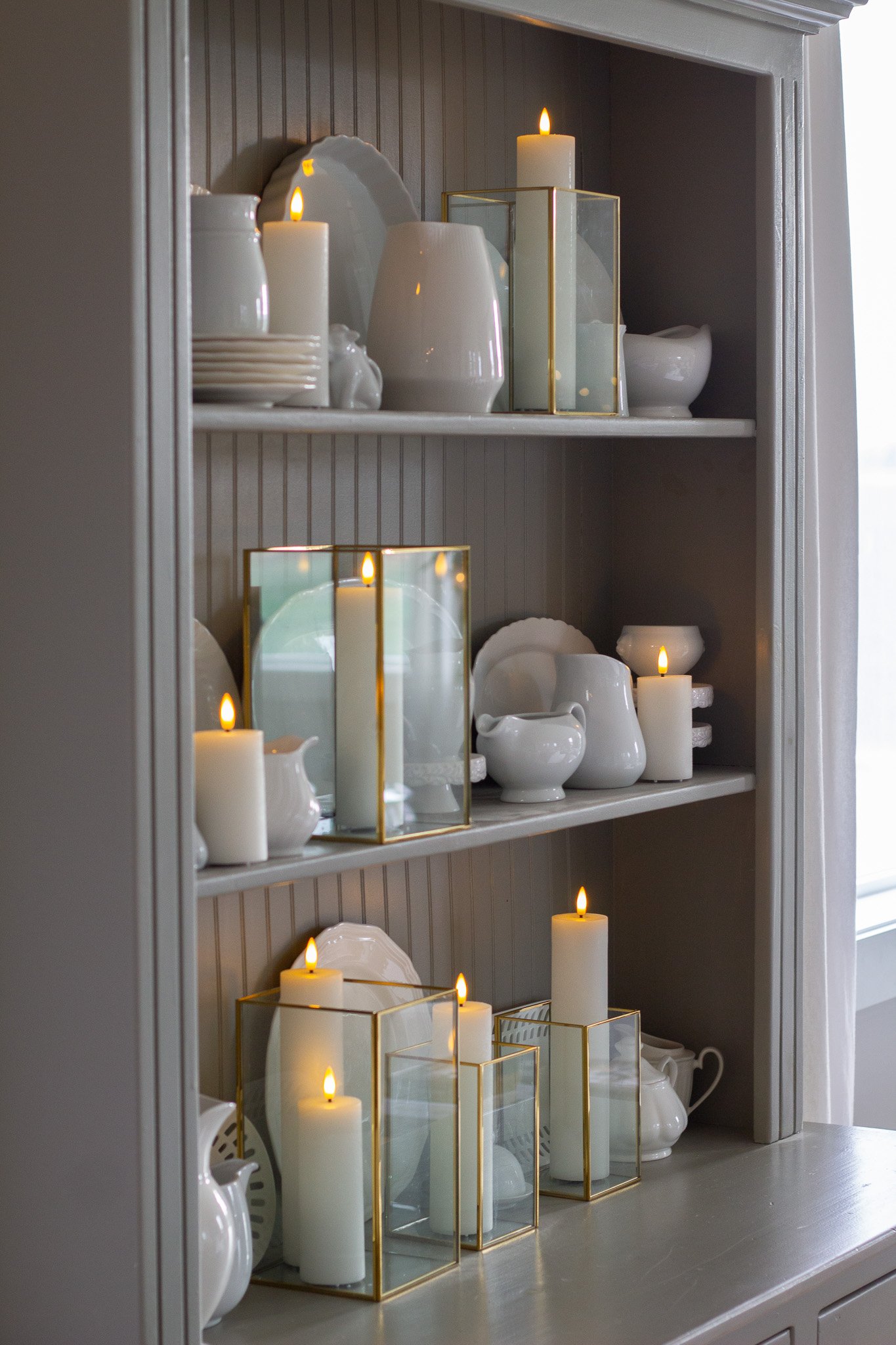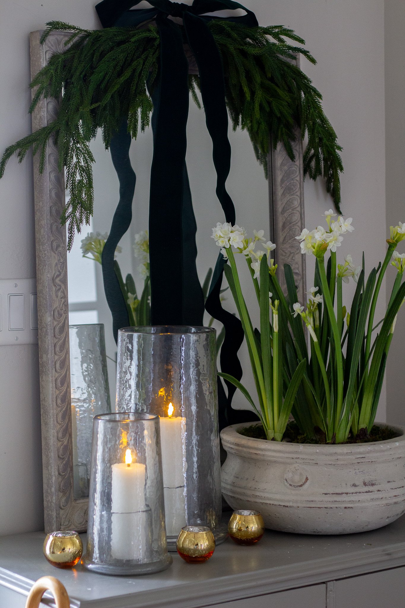 I found these glass hurricanes on clearance and ordered the small and large. They are stunning and I plan to use them for decor through every season of the year. I hope they’re still in stock, I’ll link them here if you want to grab a couple (there are 3 sizes!)