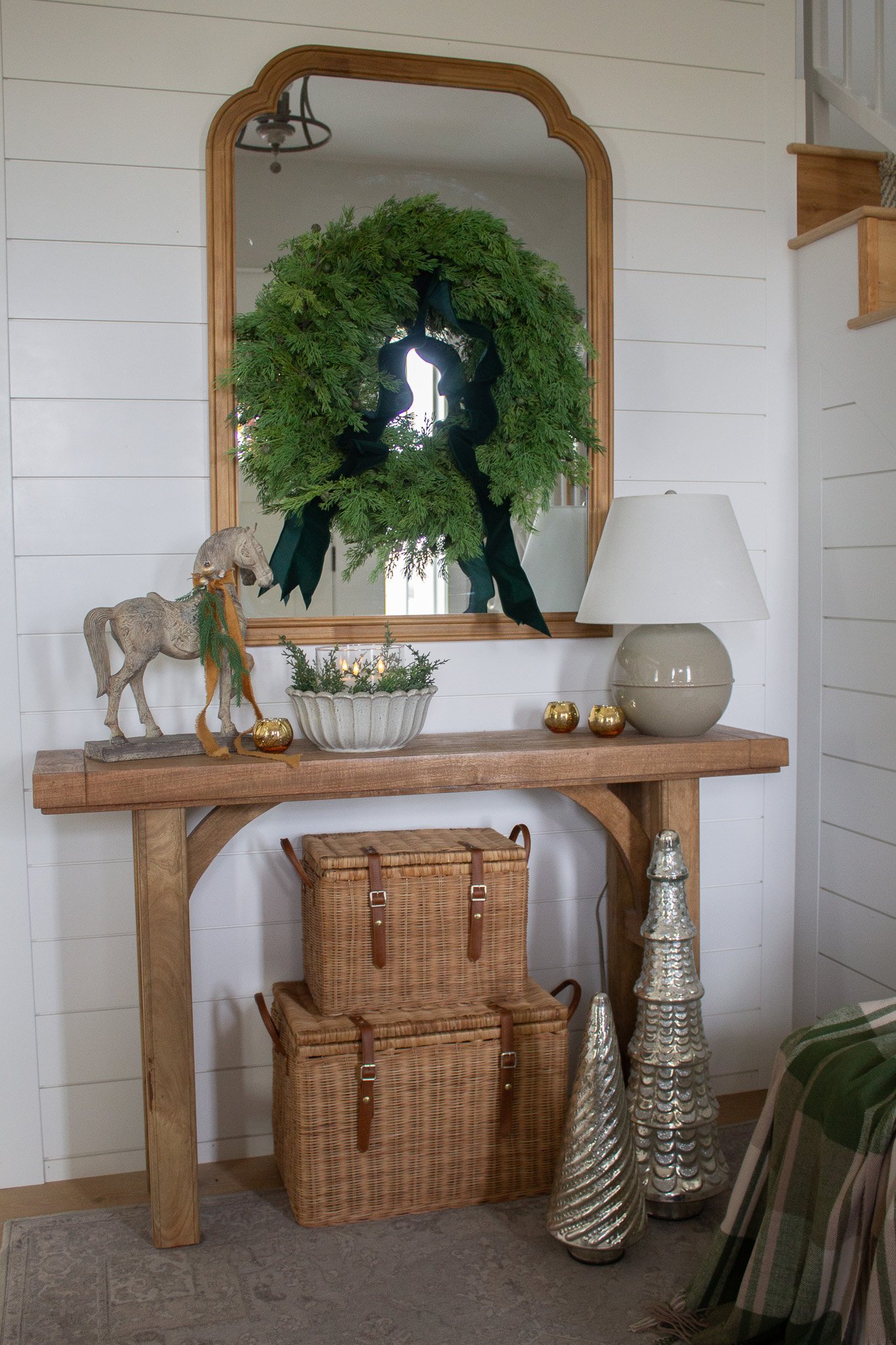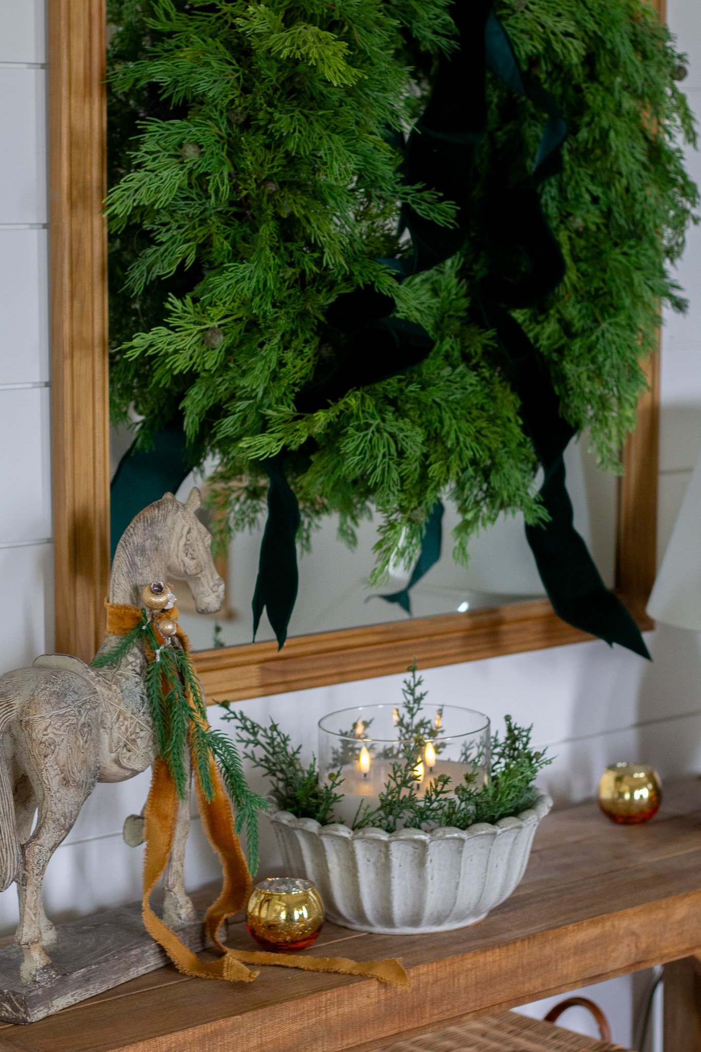 This entryway is small but always makes me smile! I added our wooden horse, this beautiful bowl from amazon (I use this all year!) and placed this flameless candle inside with some greenery around it. I also added these little gold vases all throughout our home to tie in with our gold tree. The emerald ribbon is from Hobby Lobby, it’s so pretty and looks beautiful with the wreaths! I’ll link my mirror, lamp and console here as well.