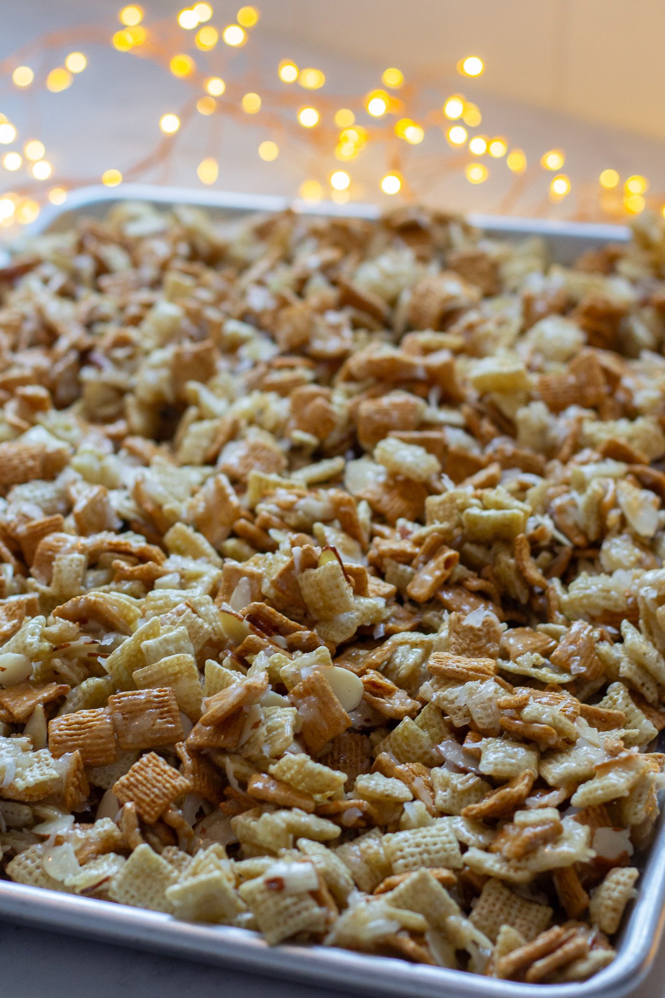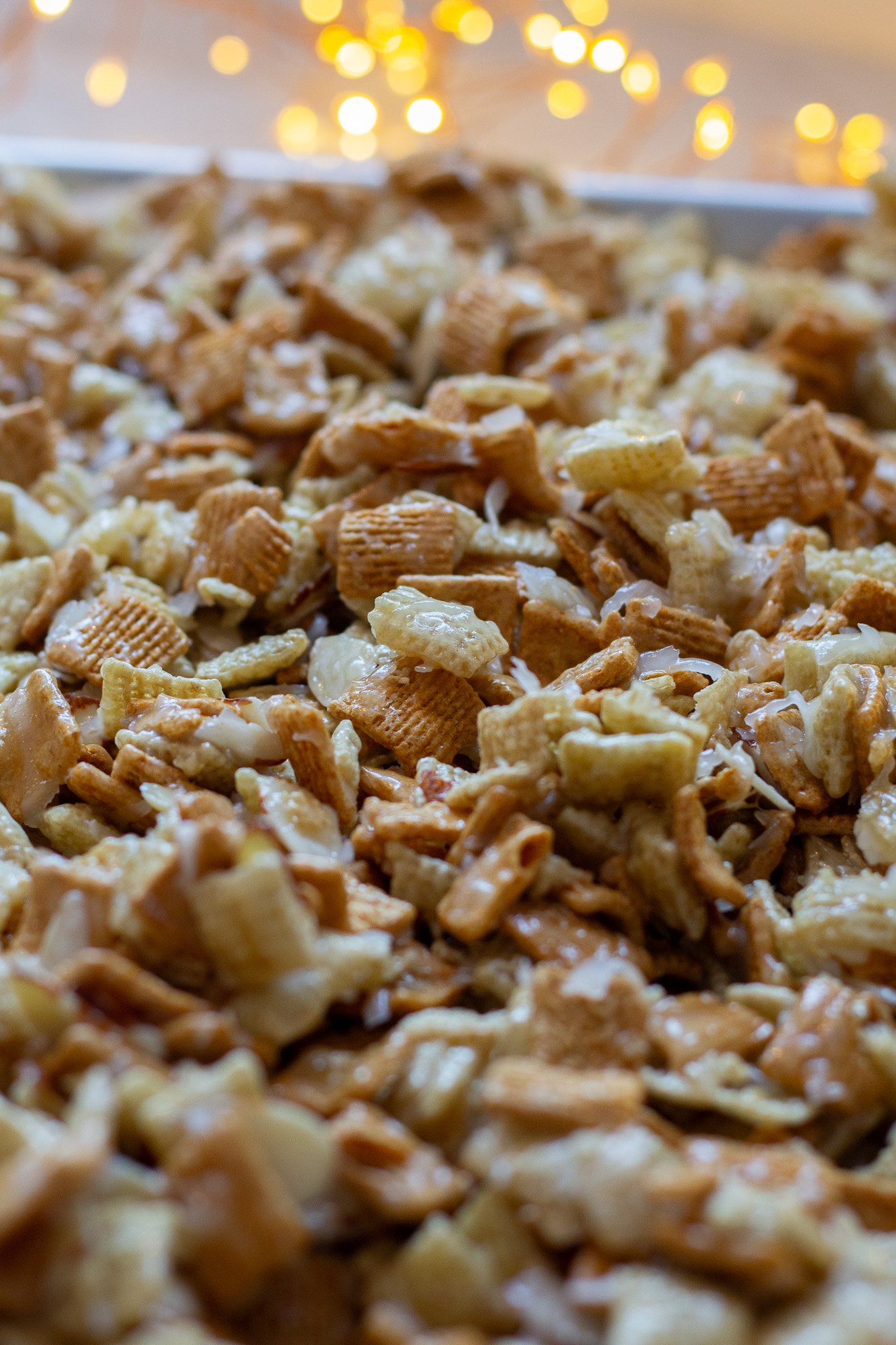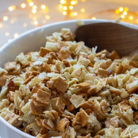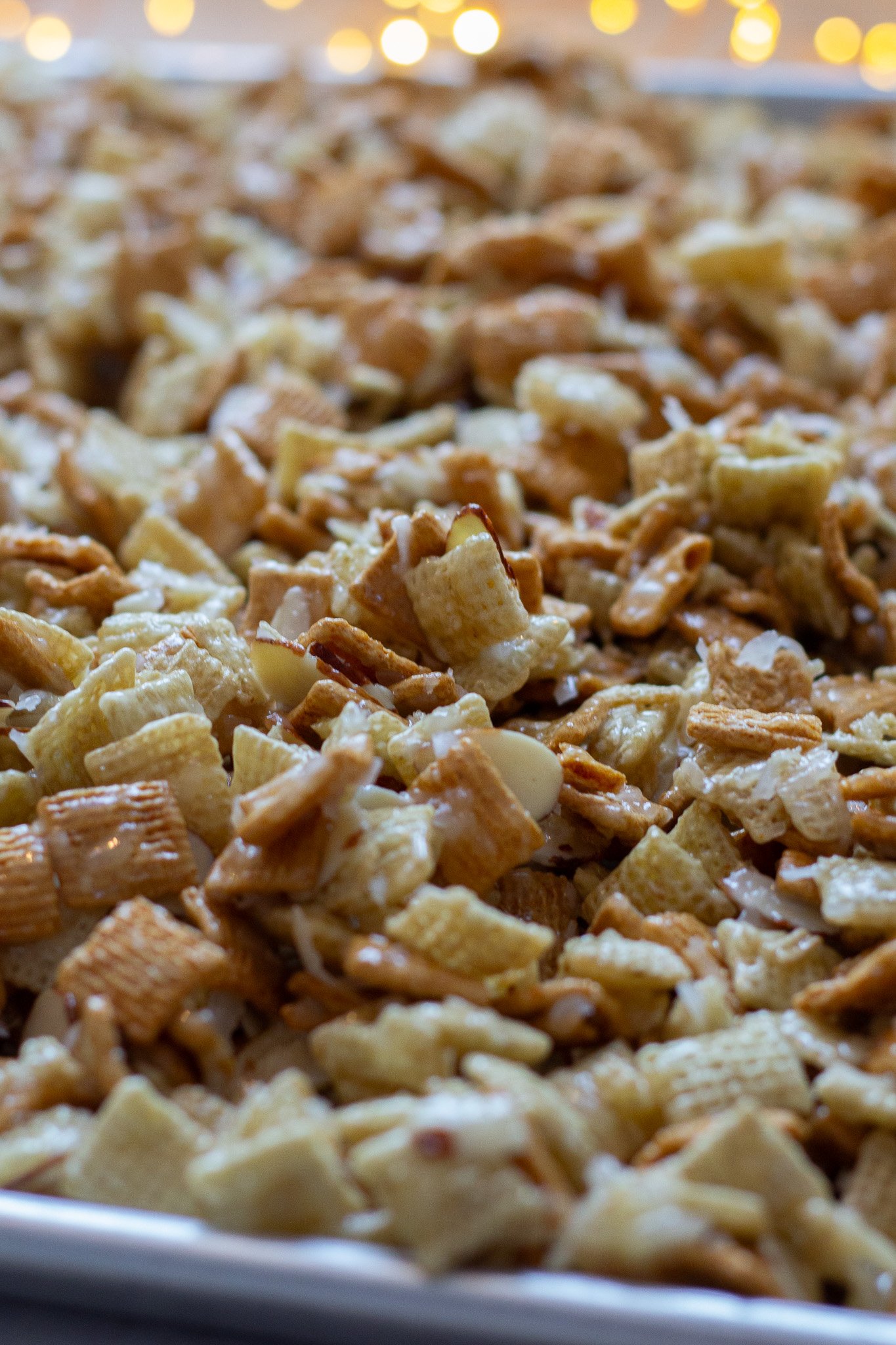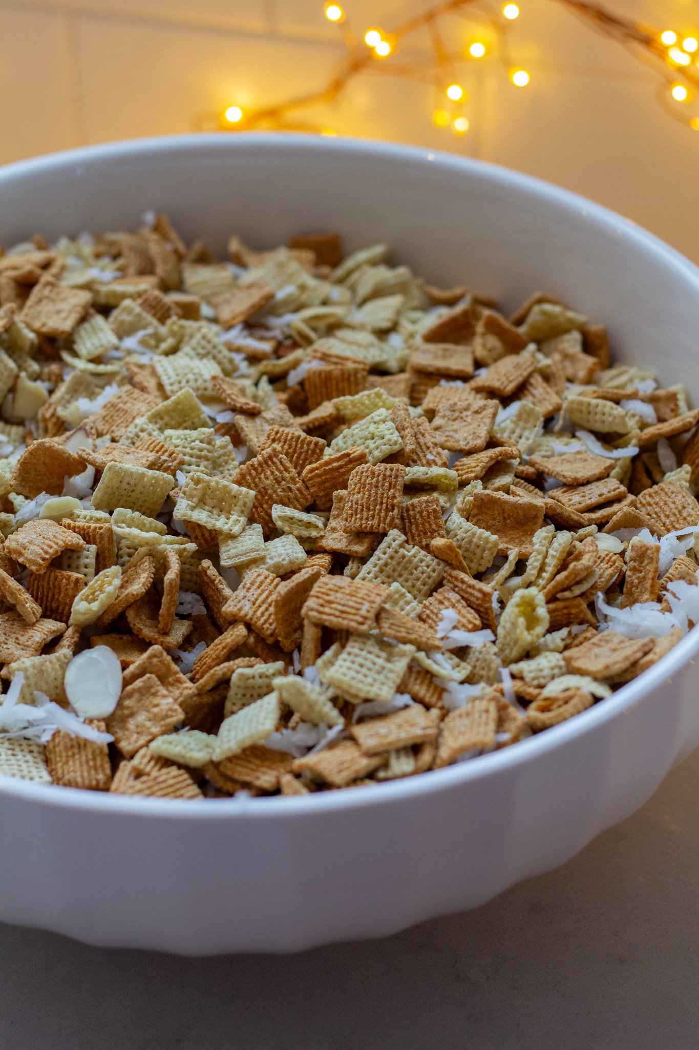 This easy coconut almond Chex mix is sweet, chewy and packed with the most delicious textures and flavors. I love the little bit of crunch and unique combination of flavors with the cereal, almonds, coconut and deliciously almond caramel-like mixture that holds it all together.