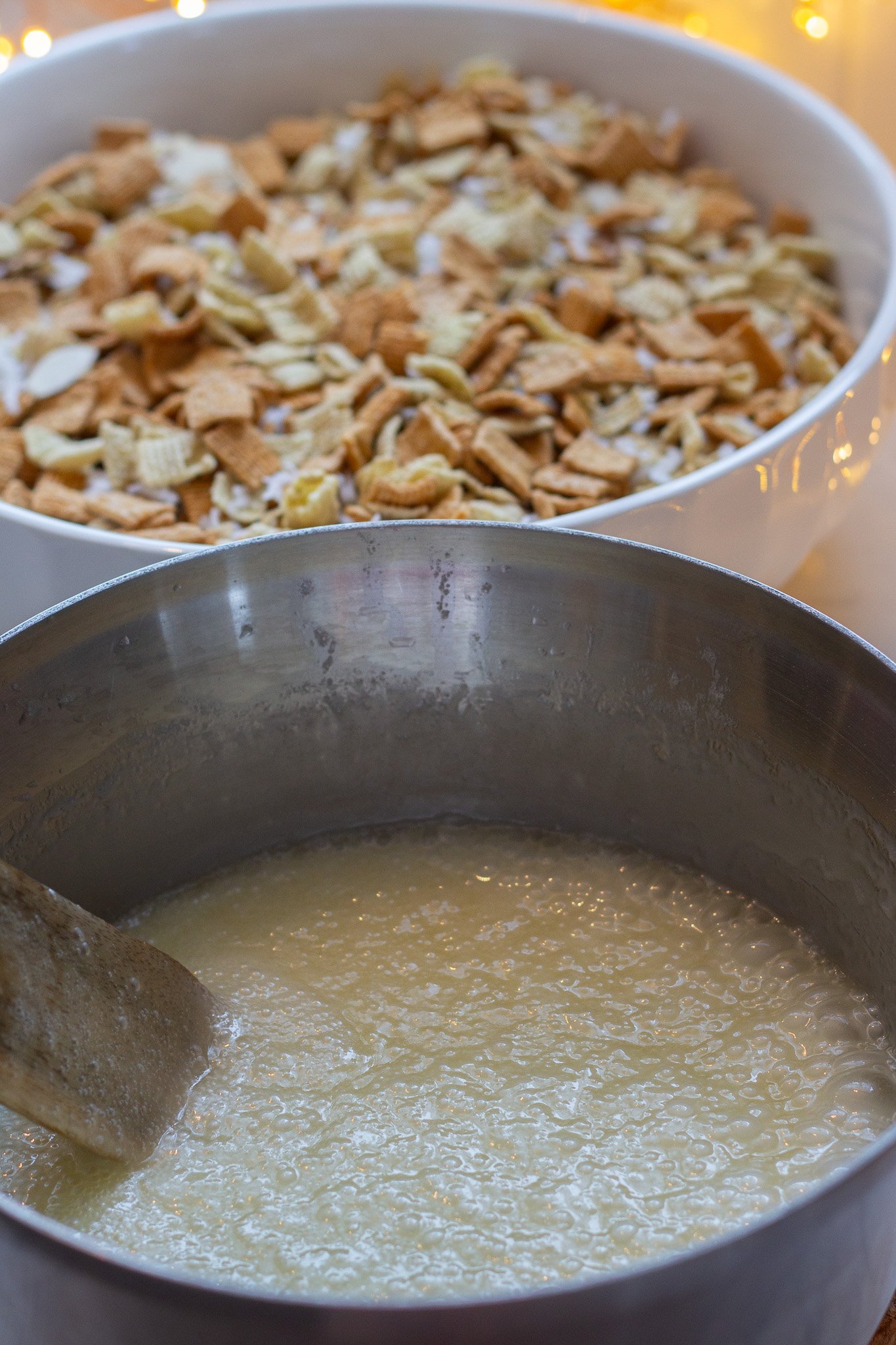 - Pour over cereal mixture and combine gently with a spatula or wood spoon to combine and coat the cereal mix.