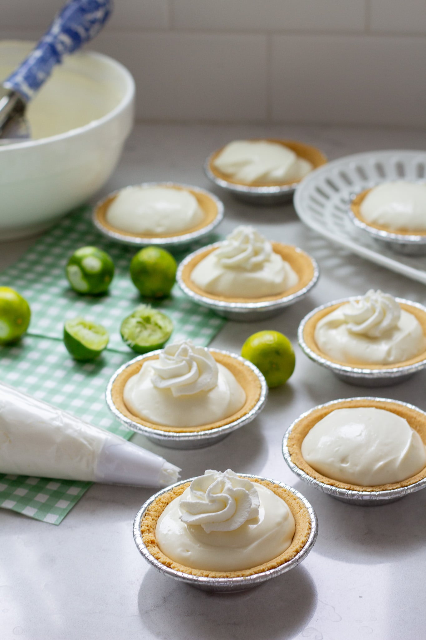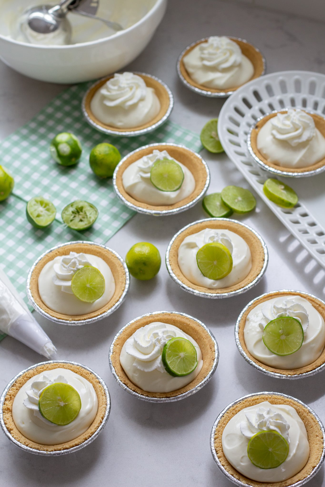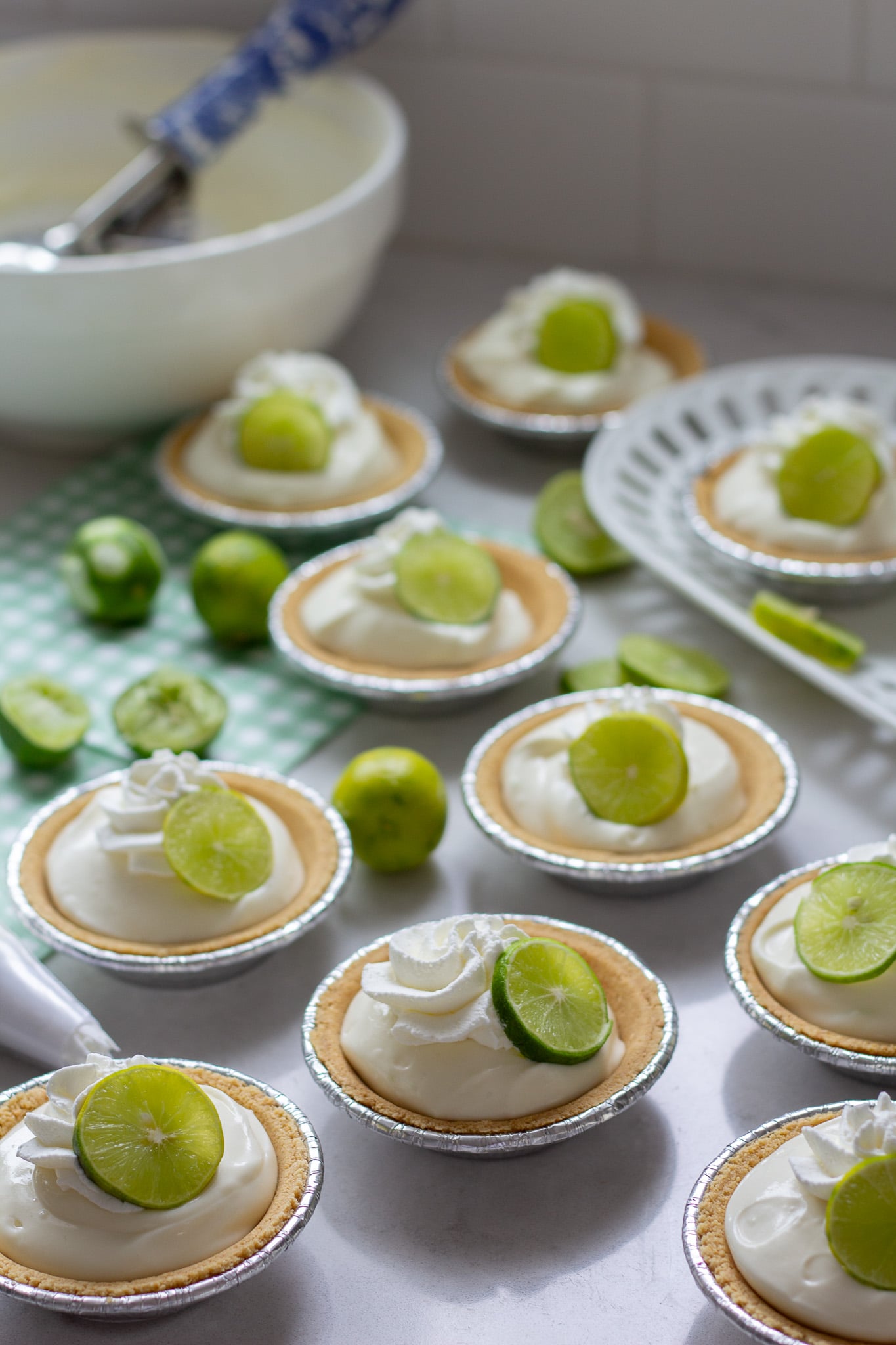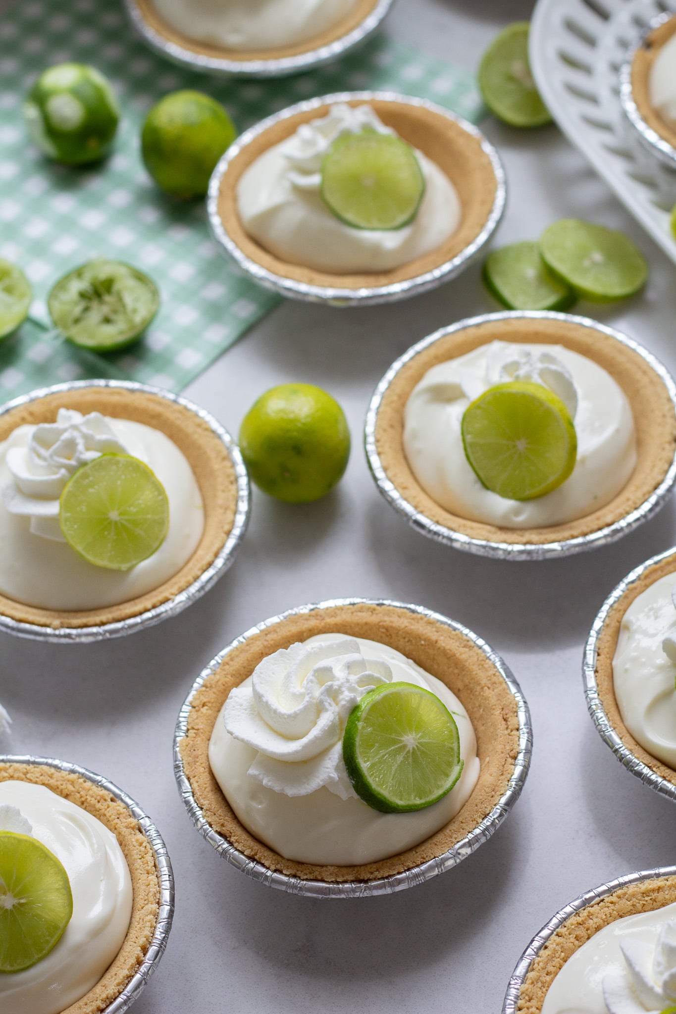 These mini key lime cheesecakes whip up in just a few minutes and you can keep them chilling in the fridge until you’re ready to serve. I love to place a fresh slice of key lime on top and you can even sprinkle a little extra lime zest to add a pop of green color. Your guests will love this vibrant dessert!