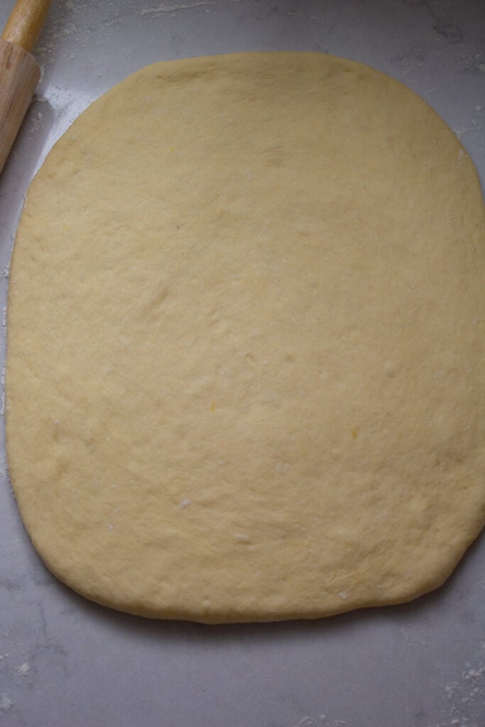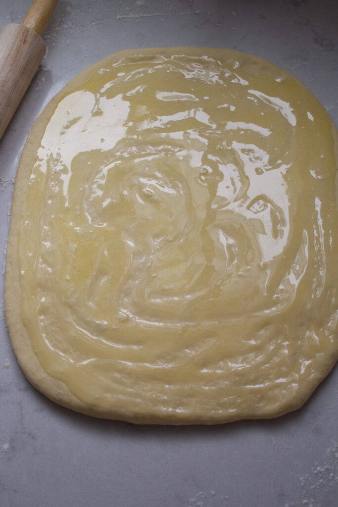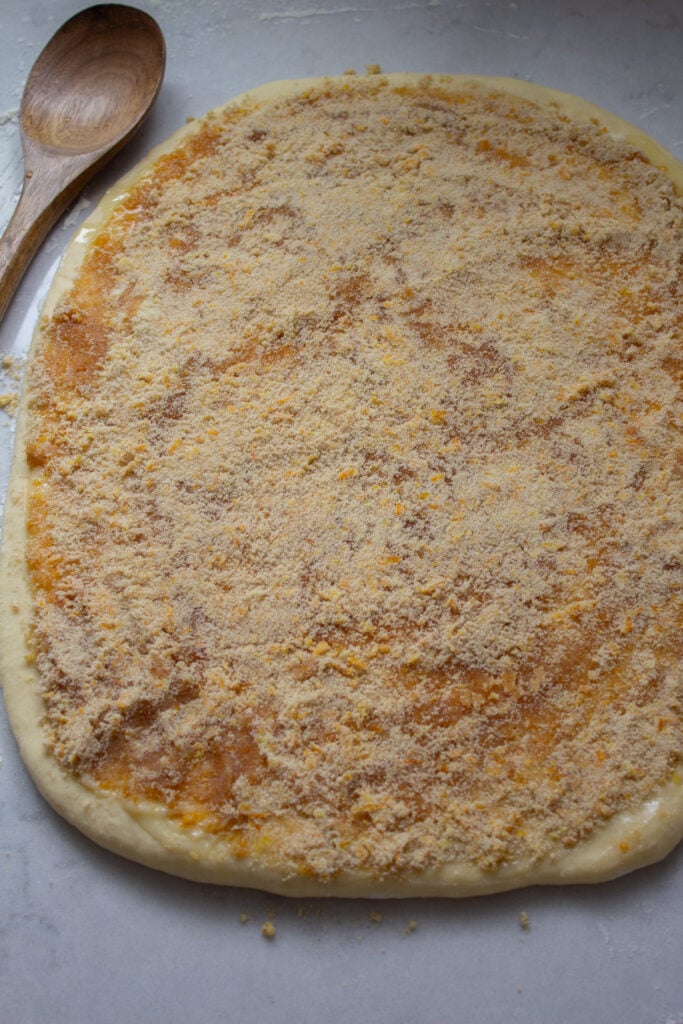 - Sprinkle flour on top of the dough if it is sticky. Roll dough into a rectangle about 11×13. Brush rectangle with 2 tablespoons melted butter. Sprinkle and spread orange sugar mixture to cover the dough.