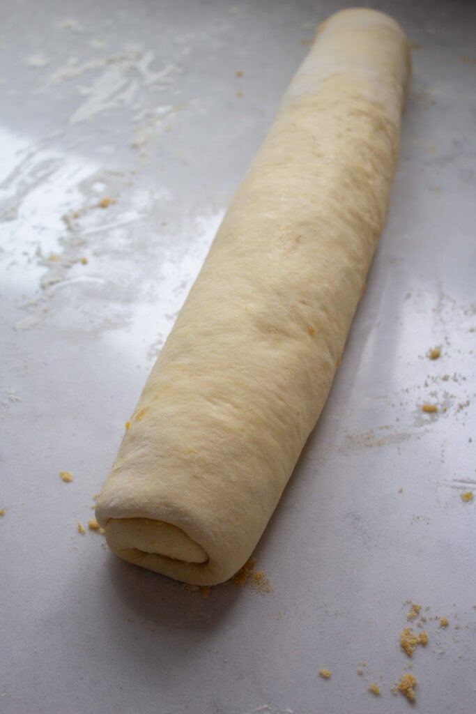 - Roll dough lengthwise like you’re making cinnamon rolls.