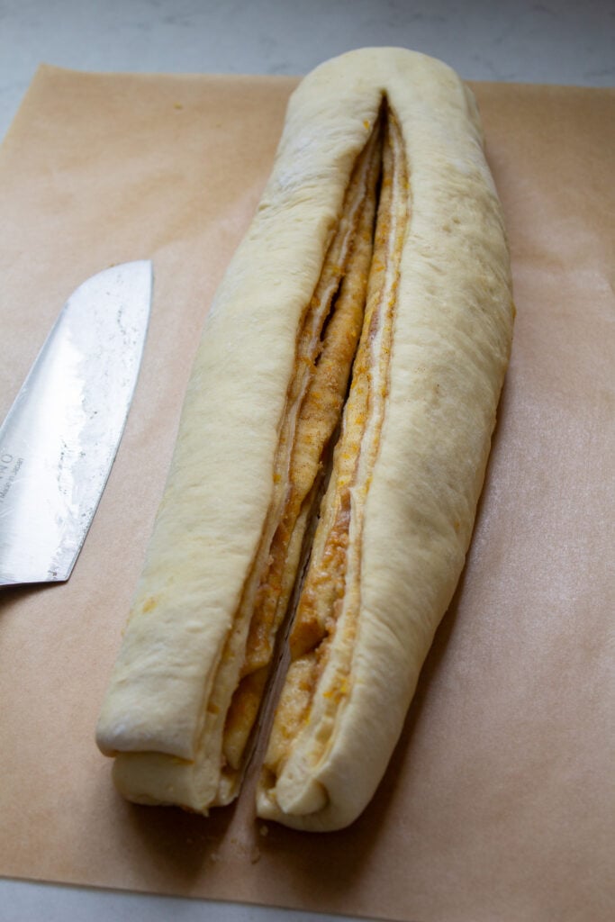 - With a pastry knife or sharp knife make a slice down the center of the roll leaving about a 1/2 inch attached at the top. Carefully (without pulling) twist dough ropes and tuck the end under.