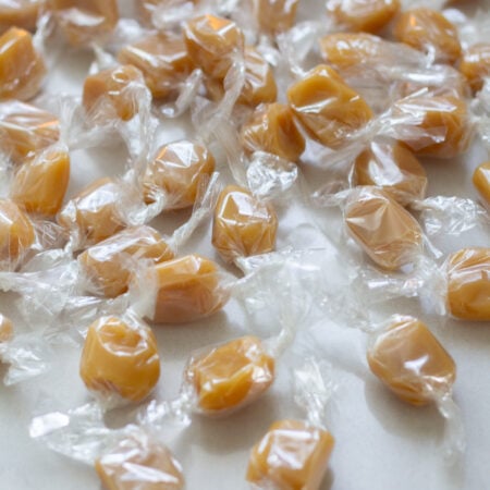 These easy caramels have been an absolute favorite of ours over the years. I used to stand over the stove with a candy thermometer, trying to get the perfect consistency on handmade caramels. NOT ANY MORE! This recipe literally takes 5 minutes to mix, and only 6 minutes 30 seconds to make in the microwave. I love that the recipe is so dependable, the caramels turn out perfect every time. We usually wrap them in cute wax papers for the holidays, but I just tested these clear wraps which were pre-cut to size, and I LOVE THEM! They look so beautiful and the clear sheets stay closed after twisting.