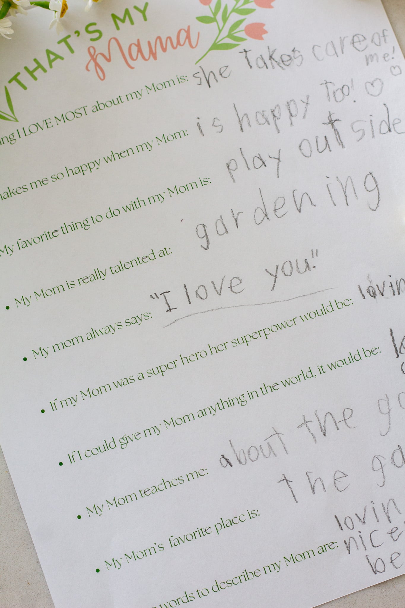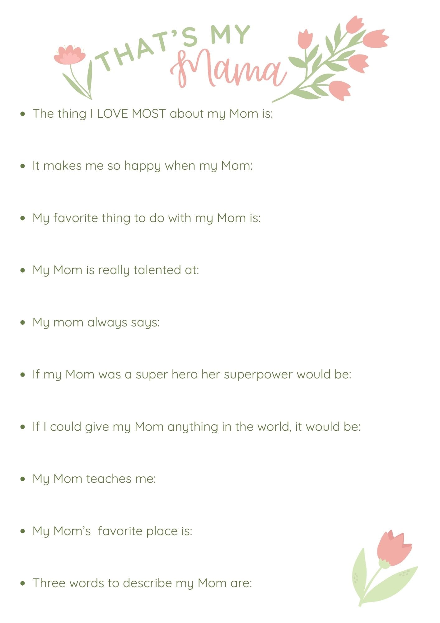 - What if my little one is too small to write it themselves? Ask them the questions and write it for them! Help them to draw a little picture on the back of the sheet, they will be so proud to show it to mama!