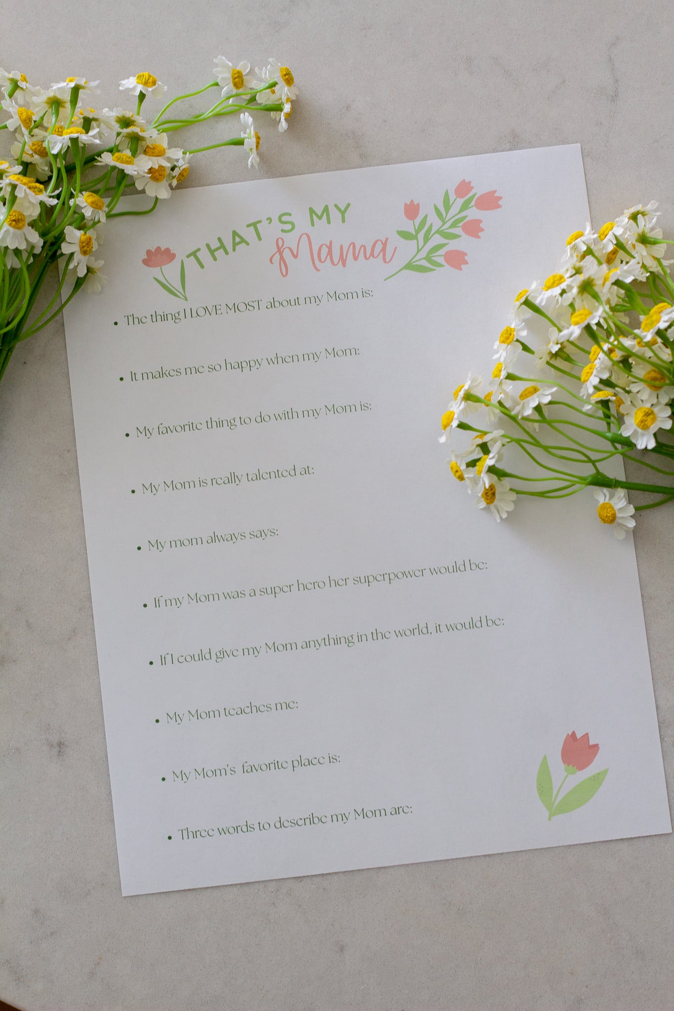 - If you want to take this printable up a notch, have your little one trace their hand on the back of the questionnaire! Then after mom reads it, have her trace her hand over the child’s tracing so you can always look back at the size difference. A fun a special little memory.
