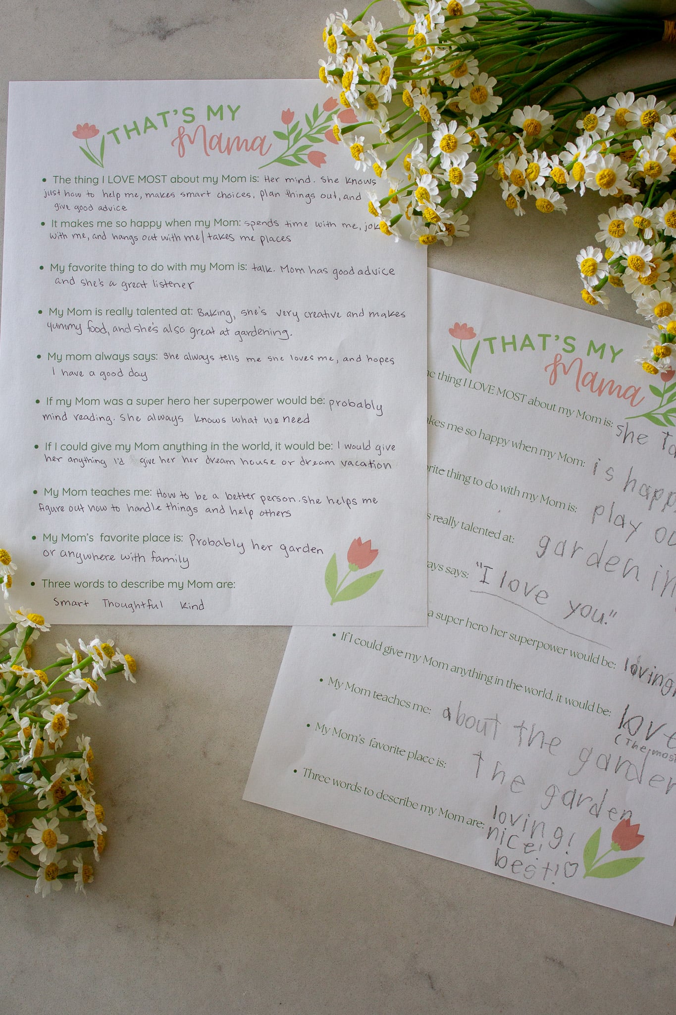 A few years ago my mom started a really fun little tradition. She sneaks my kids away and has them answer a few questions about me as their mom. She documents how they feel about me, their favorite things we do together and how they know I love them. I so look forward to this gift on Mother’s Day and the sweet little words from my children are always the most special treasure I could own! It is so fun to read the funny things they say and laugh about it again as years go by.