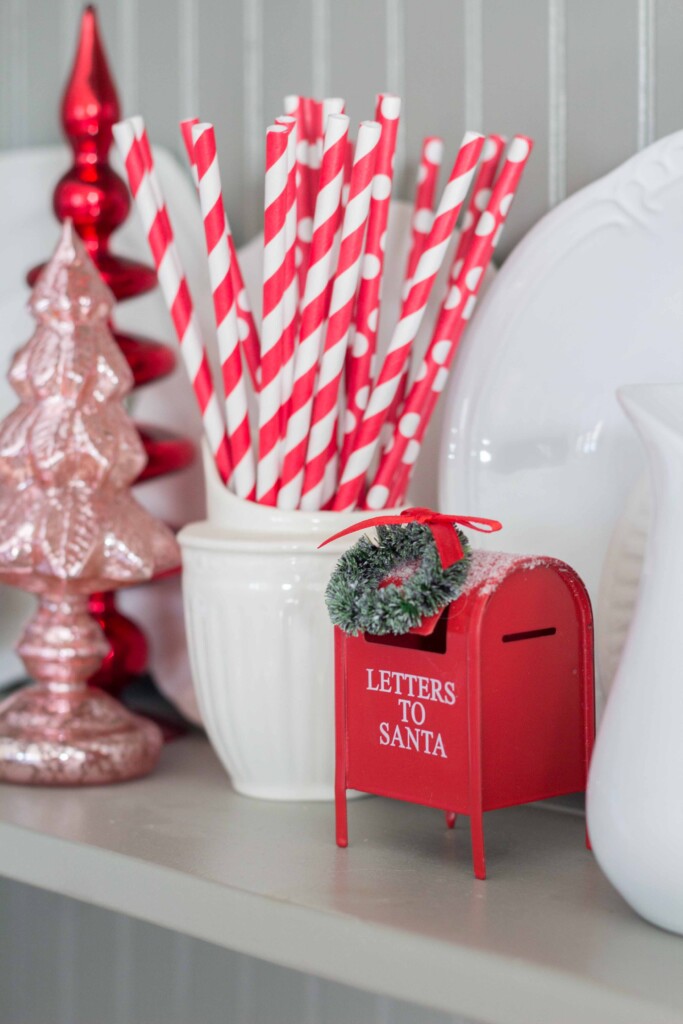 Some of the accessories, like these mini Santa mugs, the pink cake stand and the nutcracker are from Hobby lobby. My cute paper straws, mallows and paper cups are from here (click the link below to shop).