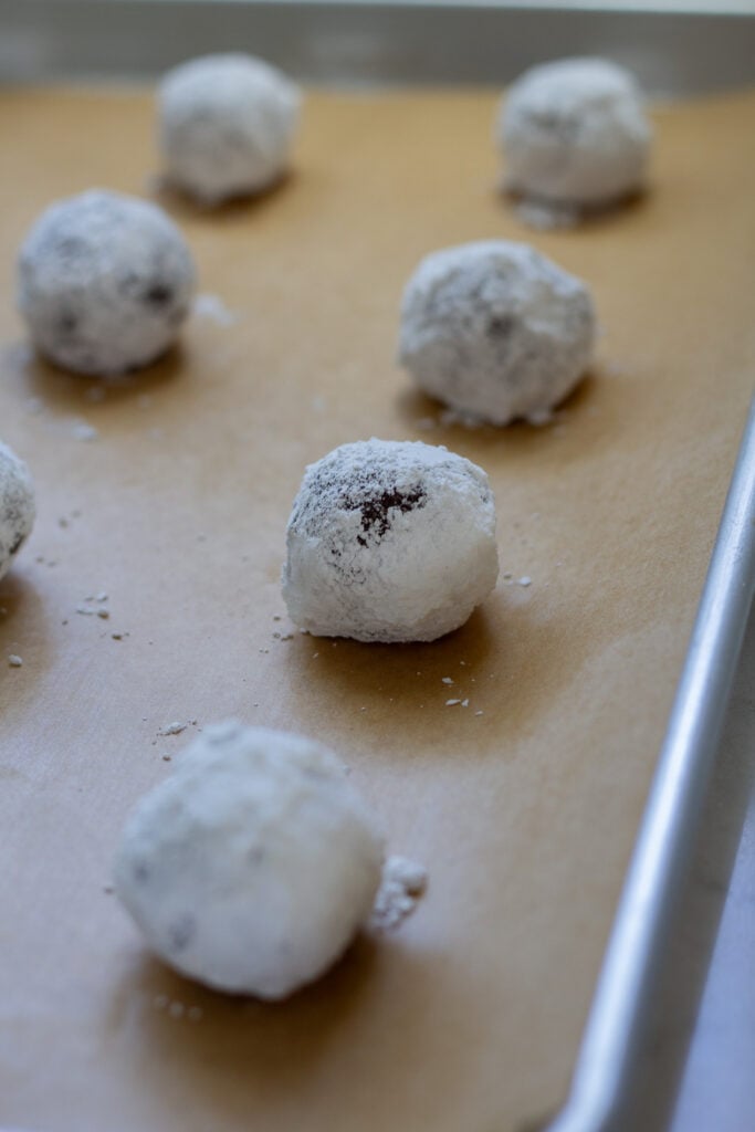 I like to roll the cookies in granulated sugar before rolling in the powdered sugar, as it helps the powdered sugar to stick, AND creates a crisp outer crust and soft center in the cookies.