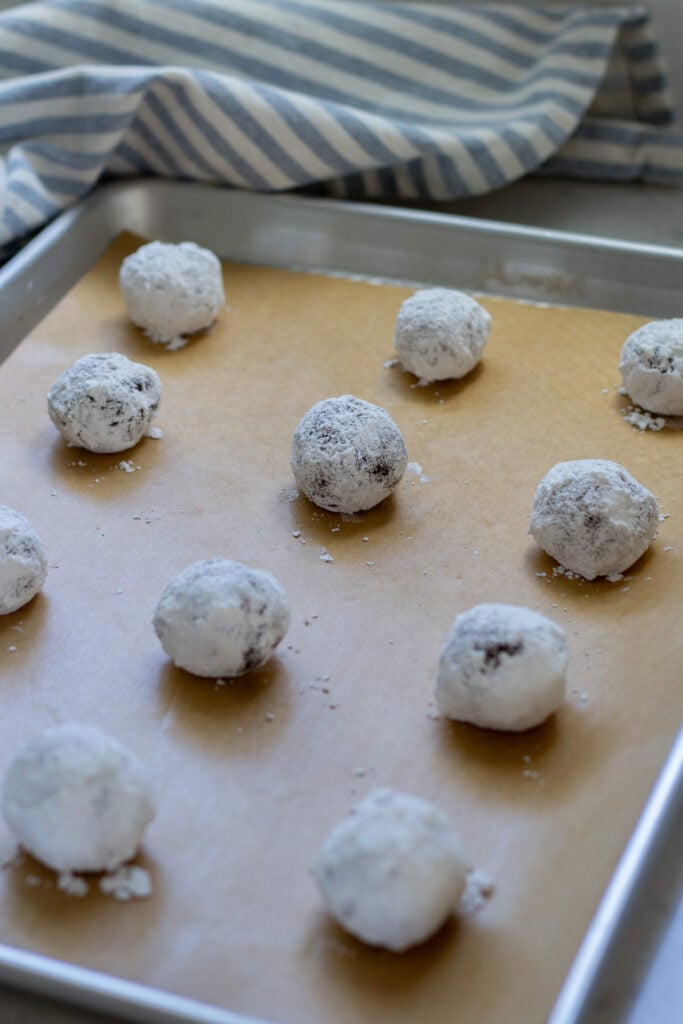 - Using a tablespoon, scoop the chilled dough and roll into 1″ balls. Roll into granulated sugar and then into powdered sugar. The granulated sugar helps create a crisp crust on the cookie and also helps the powdered sugar stick better.